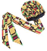 African print satin bonnet with a long ribbon wrap.